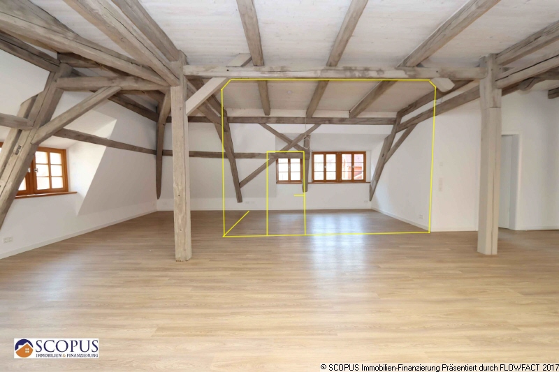 Mit ihren sichtbaren Holzbalken vermittelt die einzigartige 2-Raum-Dachgeschoss-Wohnung mit ihrer großen Wohnküche (ca. 89 m²) einen ganz besonderen Charme und Individualität. Sie zeichnet sich durch ihren offenen Grundriss aus, in der Sie Ihren persönliche Bedürfnisse zur Raumaufteilung frei gestalten können. Die Wohnung verfügt über einen hellen Küchenbereich mit Zugang zur Dachterrasse und einen attraktiven Wohnbereich. Von der Dachterrasse schauen Sie direkt zum Wahrzeichen der Stadt Meißen: Die Albrechtsburg.